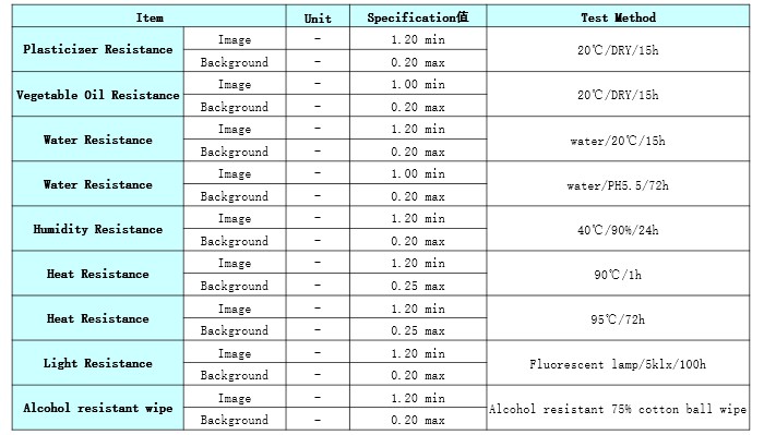 Product Caliper(μm) Heat Resistance Light Resistance Dynamic Sensitivity